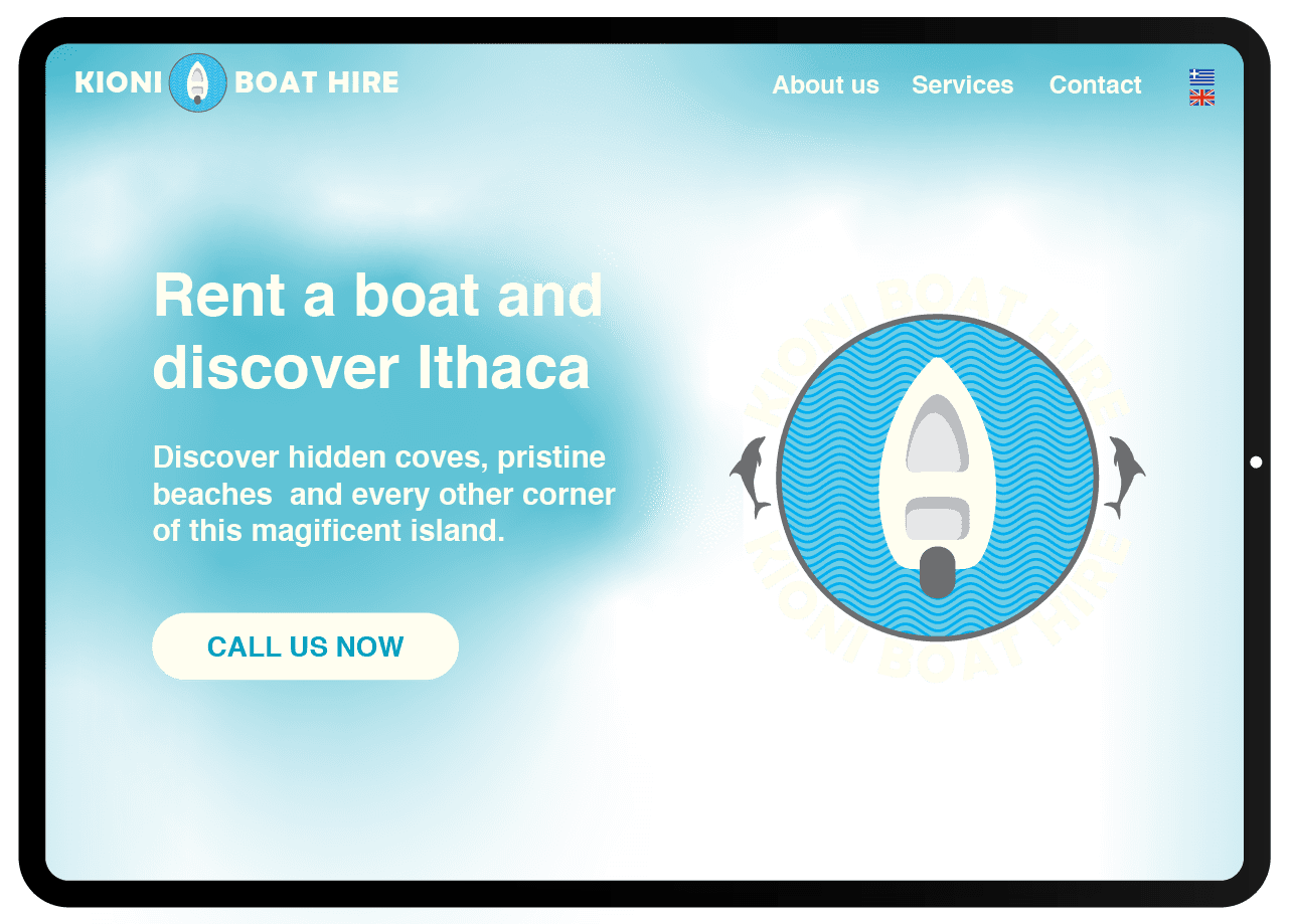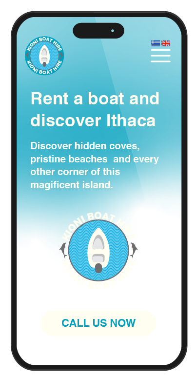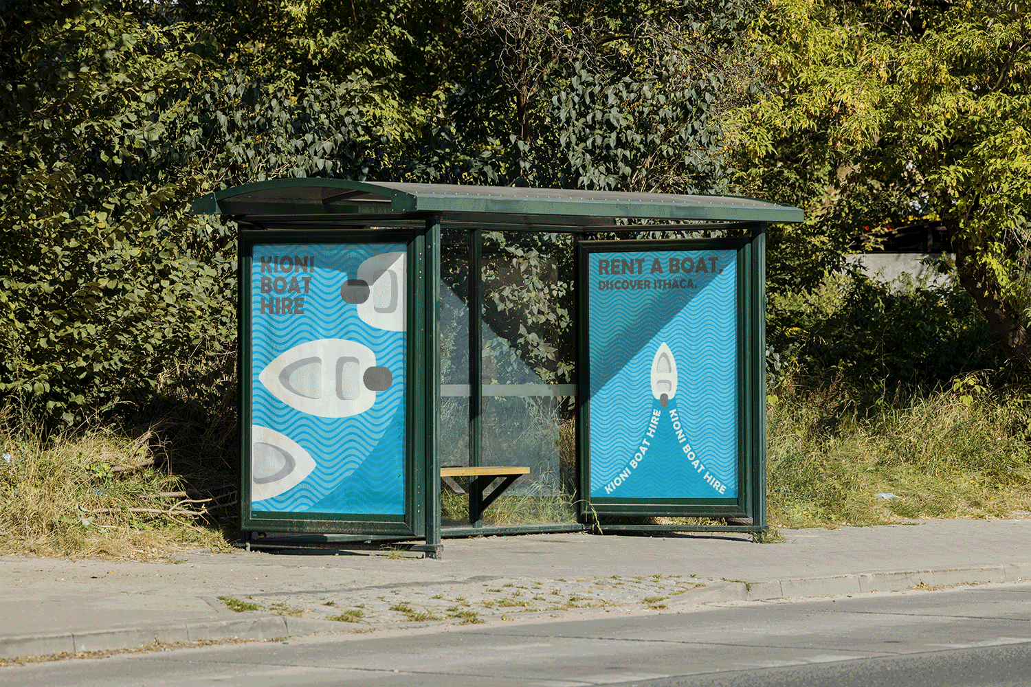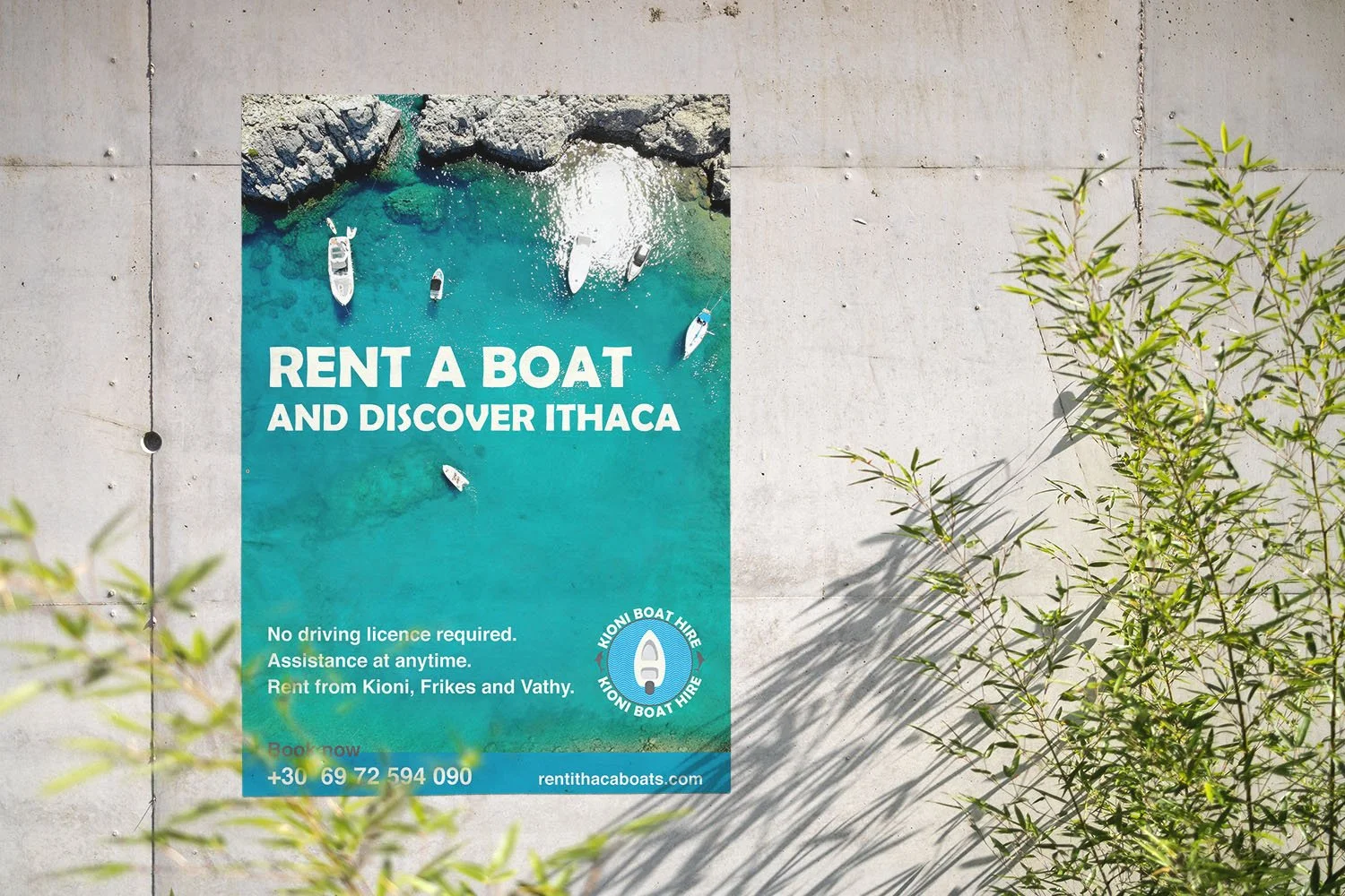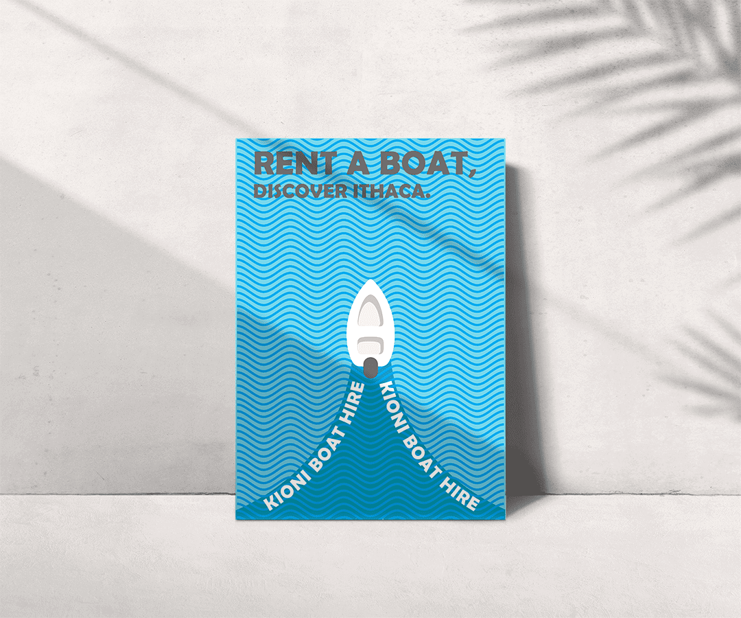 I was commissioned to create a brand identity and marketing collateral for a thriving boat rental business on the island of Ithaca. The aesthetic choices were informed by a careful analysis of the area’s tourism, target customers, and competitors. The island is primarily chosen by tourists seeking serenity, privacy, and natural beauty, and the business owners prefer to cater to families and customers over 60. The two main competitors on the island have adopted branding that emphasizes the power and performance of their boats and engines. In contrast, the logo I designed is meant to evoke themes of tranquility, discovery, and safety, with the alluring blue of the Greek sea playing a key role. Only the presence of the engine in the logo subtly hints at the technical features and performance of the boats for rent. This approach was intended to both differentiate the brand from its competitors and align with the nature of Ithaca's tourism. A simple, retro style was chosen for the marketing materials to ensure they are easily recognizable and appealing to senior customers.