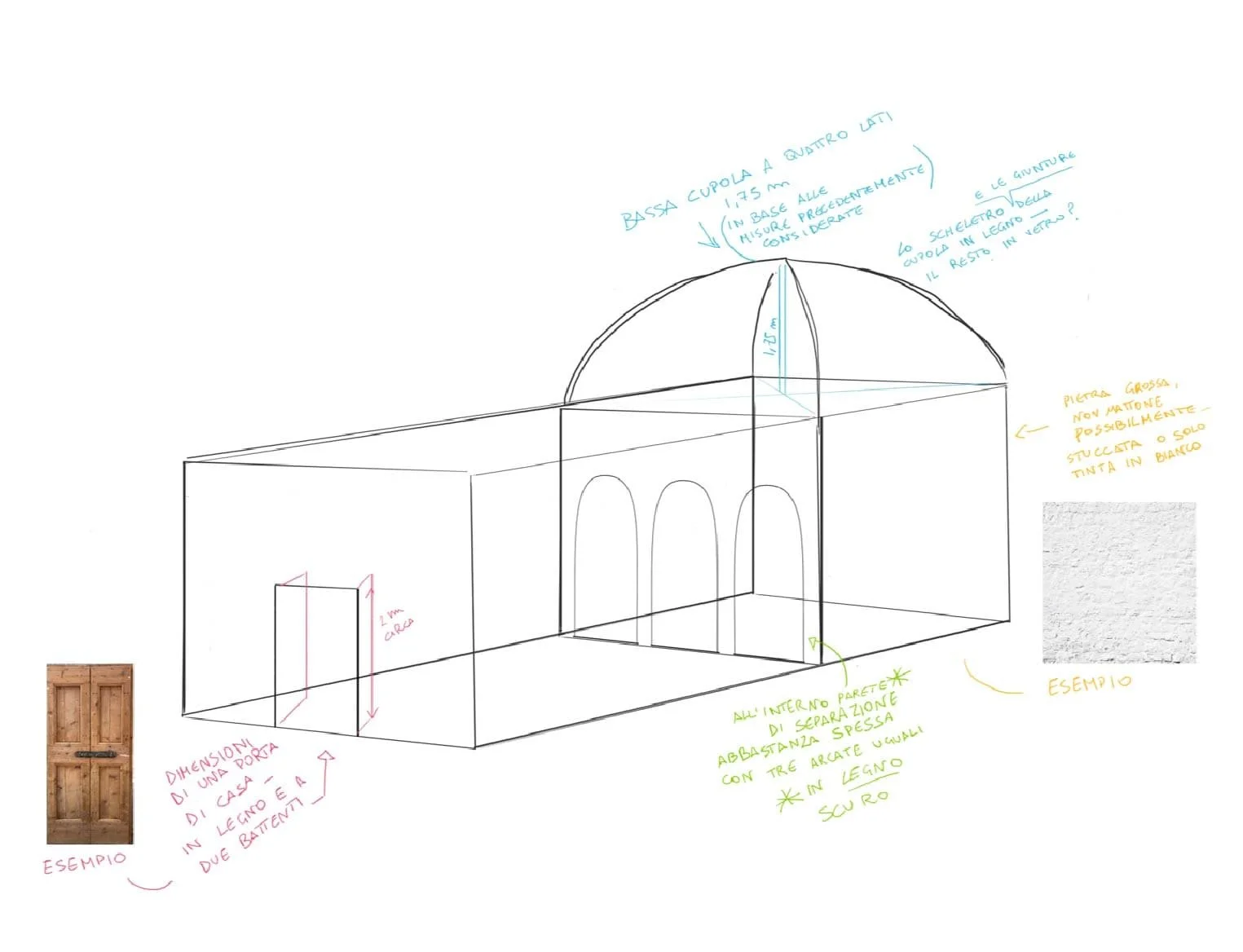 THE CHURCH’s structural and iconographic choices are tied to specific intentions. Overall, the aim is to create a space suited to the spiritual needs of humanity, one that facilitates free and authentic modes of worship and implicitly guides visitors away from transcendent salvation, toward an immanent revelation that recognizes the sacredness in the physical and inner reality. This is why a figurative iconography (evoking physicality) is chosen, with hints of dreamlike qualities (alluding to our imaginative inner reality), depicting paradisiacal scenes subtly corrupted by signs—premonitions—of pain and evil (a fire in the background, stormy clouds).