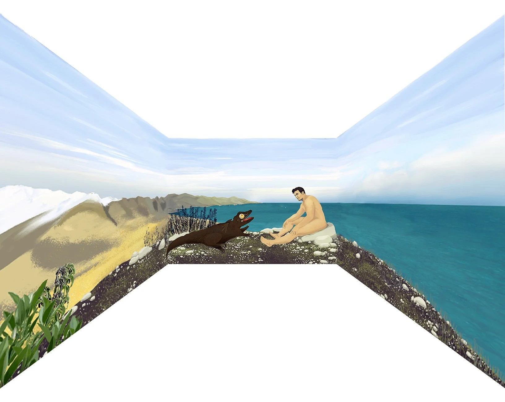The panels on the left and right walls serve as metaphors for the human condition, where individuals (represented as children) journey in discovery of a nature that is infinite and perilous, magnificent and terrifying.
