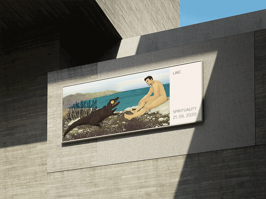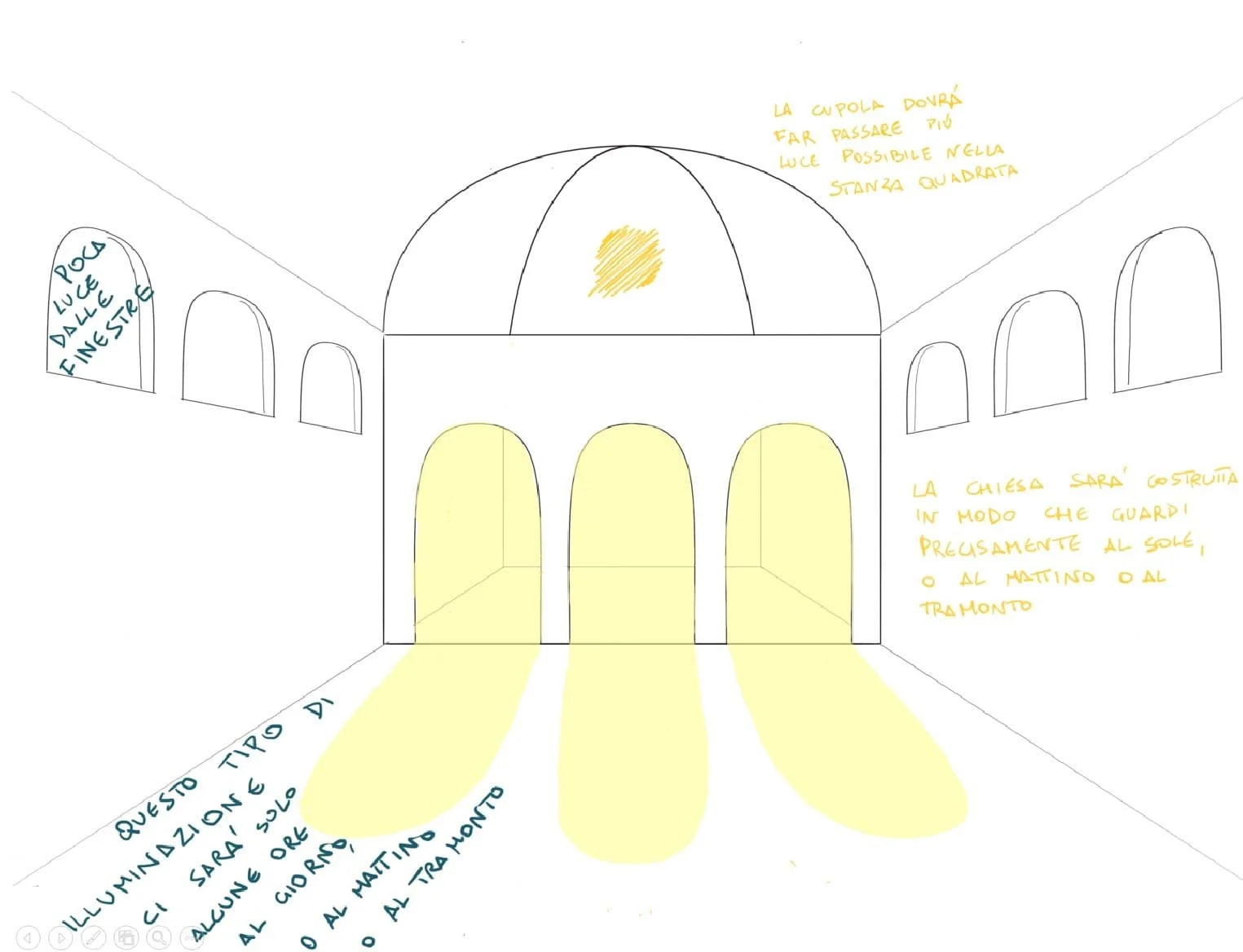 THE PROJECT starts with a careful analysis of medieval sacred art and architecture, considering its educational, propagandistic, and symbolic roles, and then makes a critical comparison with contemporary sacred art. Following a pars destruens aimed at critiquing the uses of contemporary sacred art, it presents a pars construens that seeks to “correct the errors” by proposing a laic sacredness that is pantheistic, non-soteriological, and immanent. Based on the above reflections, I designed the structure and interiors of a modern church, along with the corresponding advertising campaign.
